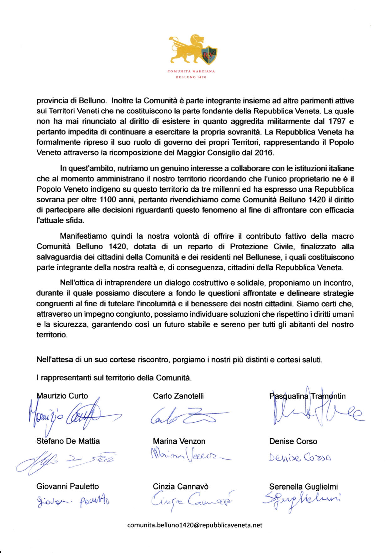 Desideriamo altresì informarLa che agiamo in qualità di rappresentanti nominati dalla nostra Comunità Veneta Marciana Belluno 1420 e pertanto componenti ufficiali del Maggior Consiglio della Repubblica Veneta, una Comunità in continua espansione sul suolo della provincia di Belluno. Inoltre la Comunità è parte integrante insieme ad altre parimenti attive sui Territori Veneti che ne costituiscono la parte fondante della Repubblica Veneta. La quale non ha mai rinunciato al diritto di esistere in quanto aggredita militarmente dal 1797 e pertanto impedita di continuare a esercitare la propria sovranità. La Repubblica Veneta ha formalmente ripreso il suo ruolo di governo dei propri Territori, rappresentando il Popolo Veneto attraverso la ricomposizione del Maggior Consiglio dal 2016.