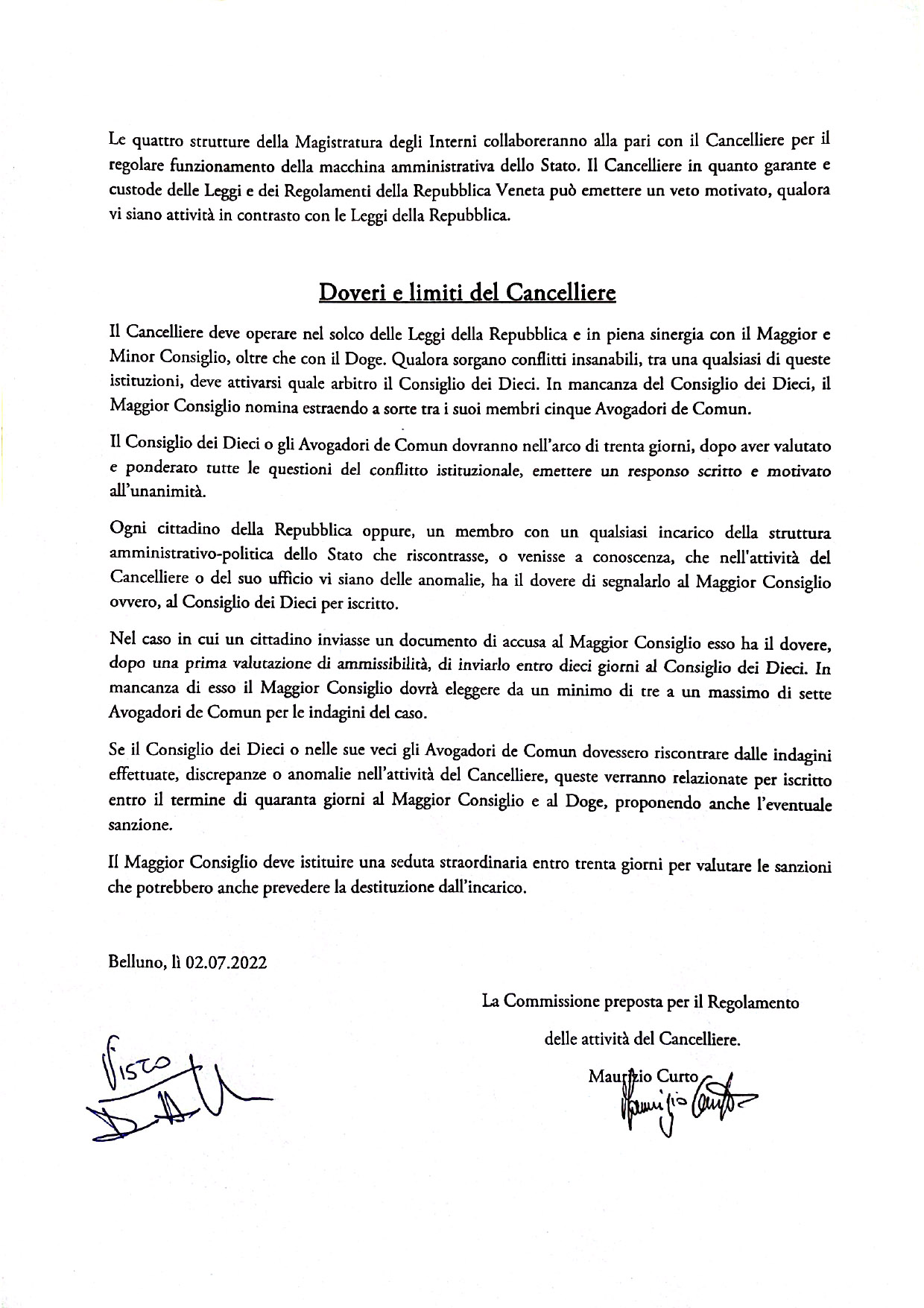 Durante la seduta in presenza e pubblica del 02.07.2022 a Borgo Valbelluna il Maggior Consiglio delibera quali sono le Funzioni e le Regole in cui opera il Cancelliere della Repubblica. Di seguito il testo deliberato e foto del Documento originale.
