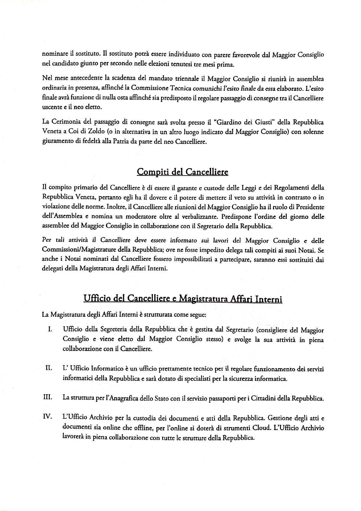 IV. L’Ufficio Archivio per la custodia dei documenti e atti della Repubblica. Gestione degli atti e documenti sia online che offline, per l’online si doterà di strumenti Cloud. L’Ufficio Archivio lavorerà in piena collaborazione con tutte le strutture della Repubblica.