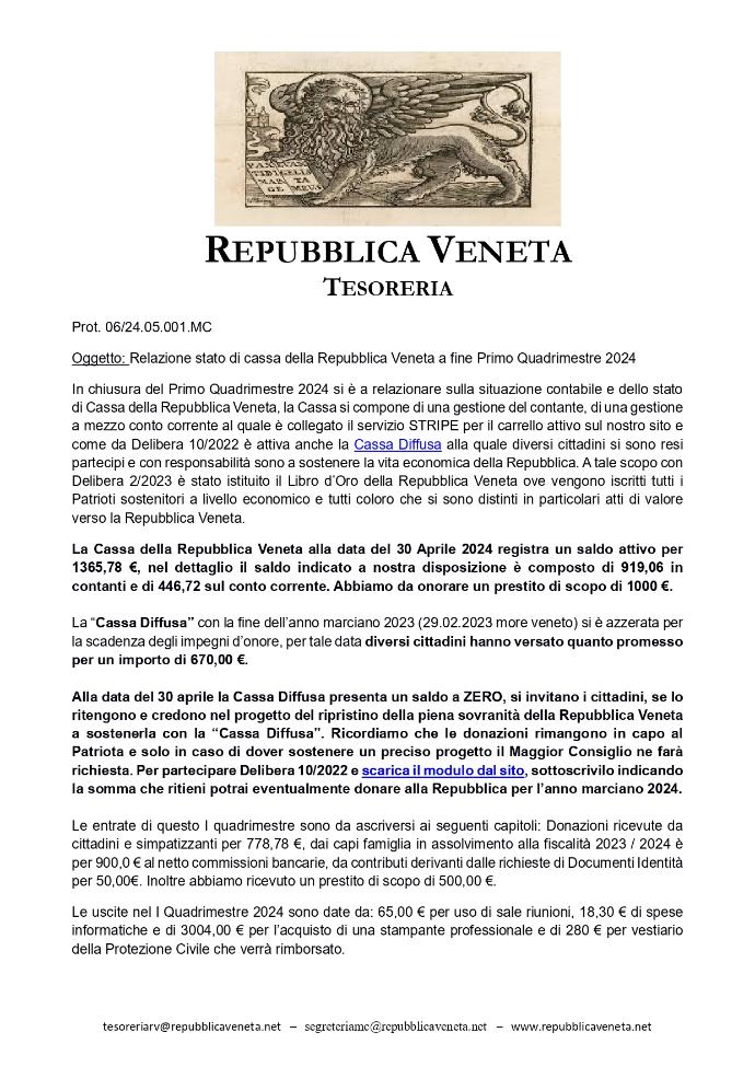 Caro Cittadino della Repubblica Veneta, nell'assolvere il proprio mandato e come da regolamento, la Tesoreria con proprio documento pubblica la relazione di Cassa della Repubblica Veneta certificata per il I Quadrimestre 2024 (vedi fondo pagina) con le sue conclusioni e approvata nella riunione in presenza del Maggior Consiglio del 08.06.2024.