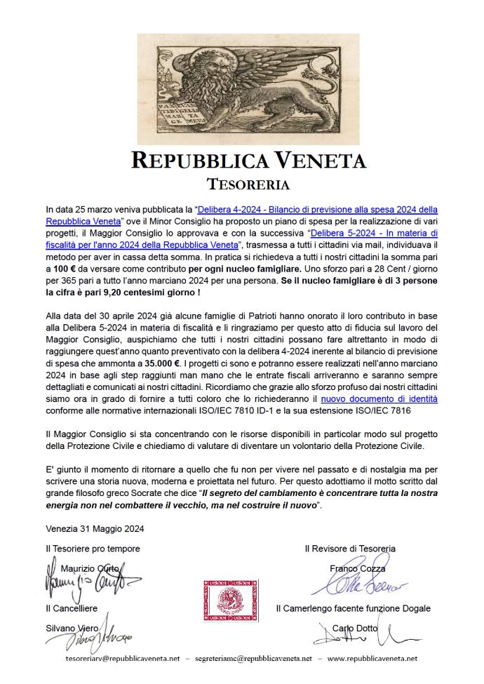 [ESTRATTO dal verbale di Cassa] - In data 25 marzo veniva pubblicata la “Delibera 4-2024 - Bilancio di previsione alla spesa 2024 della Repubblica Veneta” ove il Minor Consiglio ha proposto un piano di spesa per la realizzazione di vari progetti, il Maggior Consiglio lo approvava e con la successiva “Delibera 5-2024 - In materia di fiscalità per l'anno 2024 della Repubblica Veneta”, trasmessa a tutti i cittadini via mail, individuava il metodo per aver in cassa detta somma. In pratica si richiedeva a tutti i nostri cittadini la somma pari a 100 € da versare come contributo per ogni nucleo famigliare. Uno sforzo pari a 28 Cent / giorno per 365 pari a tutto l’anno marciano 2024 per una persona. Se il nucleo famigliare è di 3 persone la cifra è pari 9,20 centesimi giorno!  Clicca qui per onorare il tuo contributo.