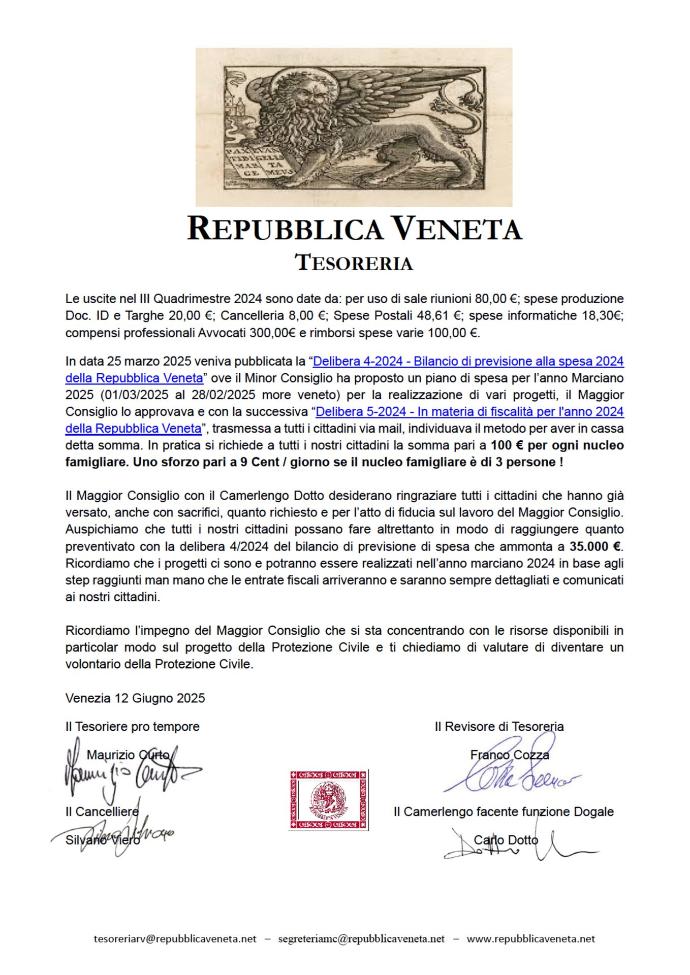 Caro Cittadino della Repubblica Veneta, nell'assolvere il proprio mandato e come da regolamento, la Tesoreria con proprio documento pubblica la relazione di Cassa della Repubblica Veneta certificata per il I Quadrimestre 2025  con le sue conclusioni e approvata nella riunione in presenza del Maggior Consiglio del 12.06.2025.