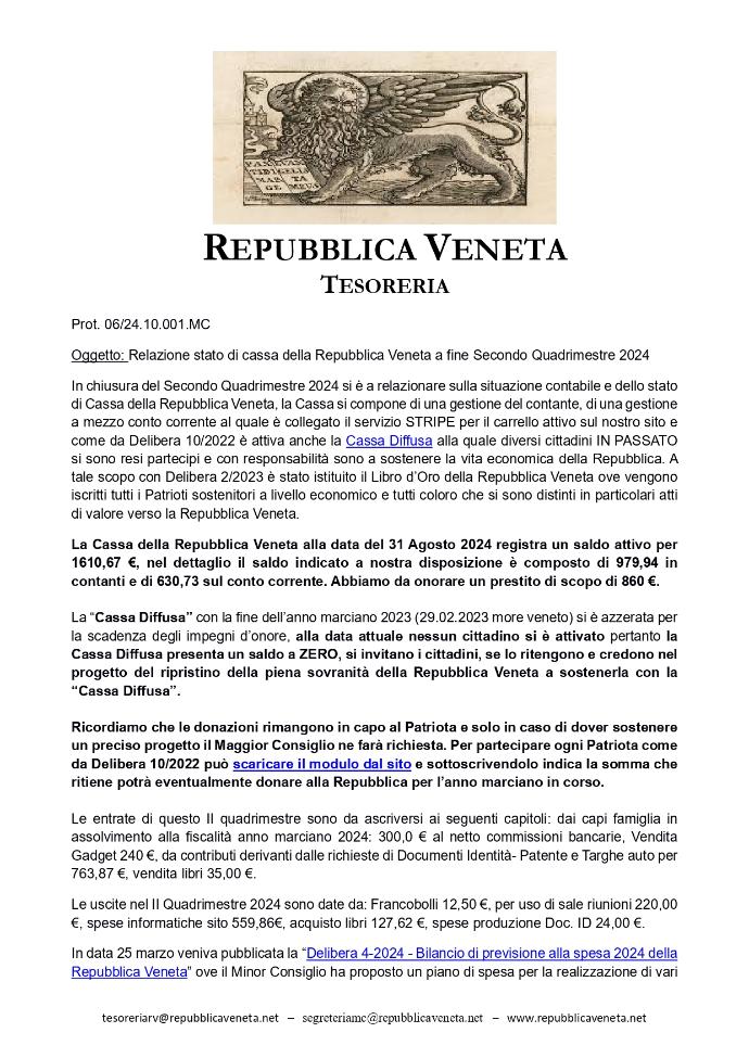Caro Cittadino della Repubblica Veneta, nell'assolvere il proprio mandato e come da regolamento, la Tesoreria con proprio documento pubblica la relazione di Cassa della Repubblica Veneta certificata per il II Quadrimestre 2024 con le sue conclusioni e approvata nella riunione in presenza del Maggior Consiglio del 09.11.2024.