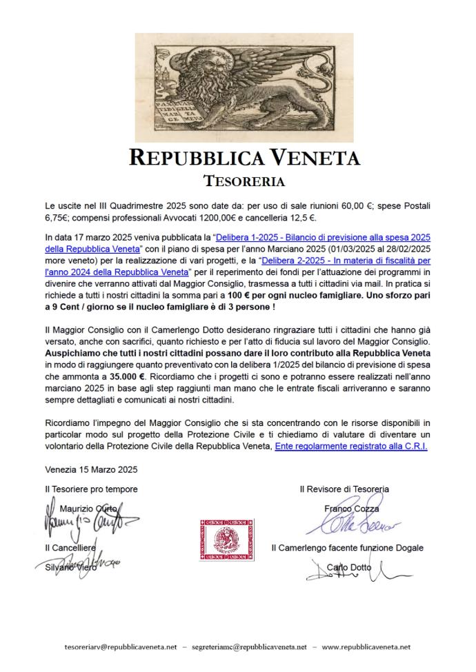 Caro Cittadino della Repubblica Veneta, nell'assolvere il proprio mandato e come da regolamento, la Tesoreria con proprio documento pubblica la relazione di Cassa della Repubblica Veneta certificata per il III Quadrimestre 2025 con le sue conclusioni e approvata nella riunione del Maggior Consiglio del 12.03.2026.