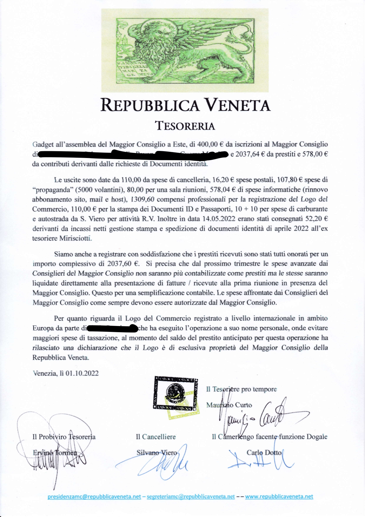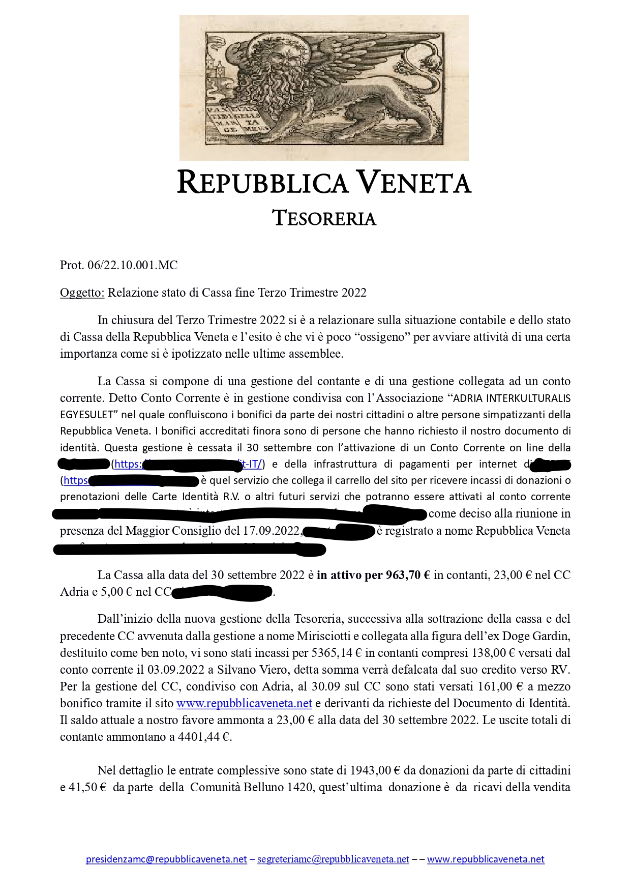 Come deciso nella riunione mensile, in presenza, del Maggior Consiglio del 19.11.2022 siamo a condividere con i Cittadini della Repubblica la relazione di Cassa per il terzo trimestre 2022 da parte del Tesoriere pro tempore. Relazione approvata all'unanimità.