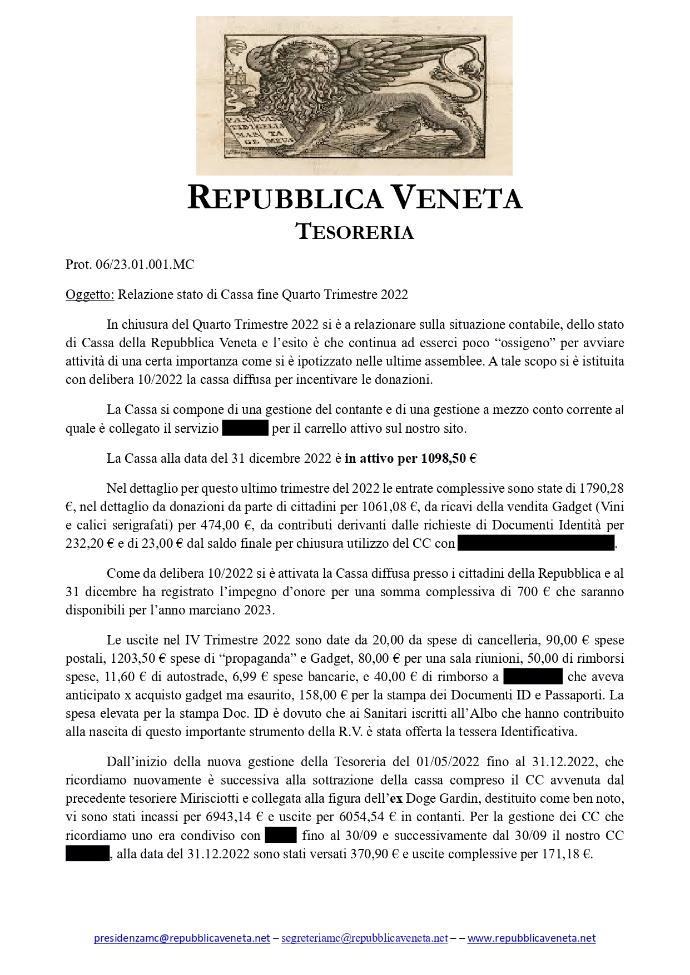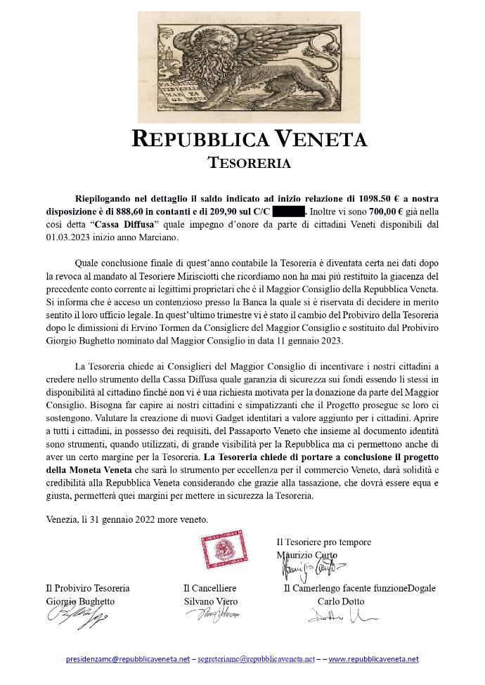 Caro cittadino della Repubblica Veneta, nell'assolvere il proprio mandato e come da regolamento, la Tesoreria con proprio documento pubblica la relazione di Cassa della Repubblica Veneta certificata per il IV Trimestre 2022 (vedi fondo pagina) con le sue conclusioni e auspici per migliorare la nostra situazione economica per il 2023.