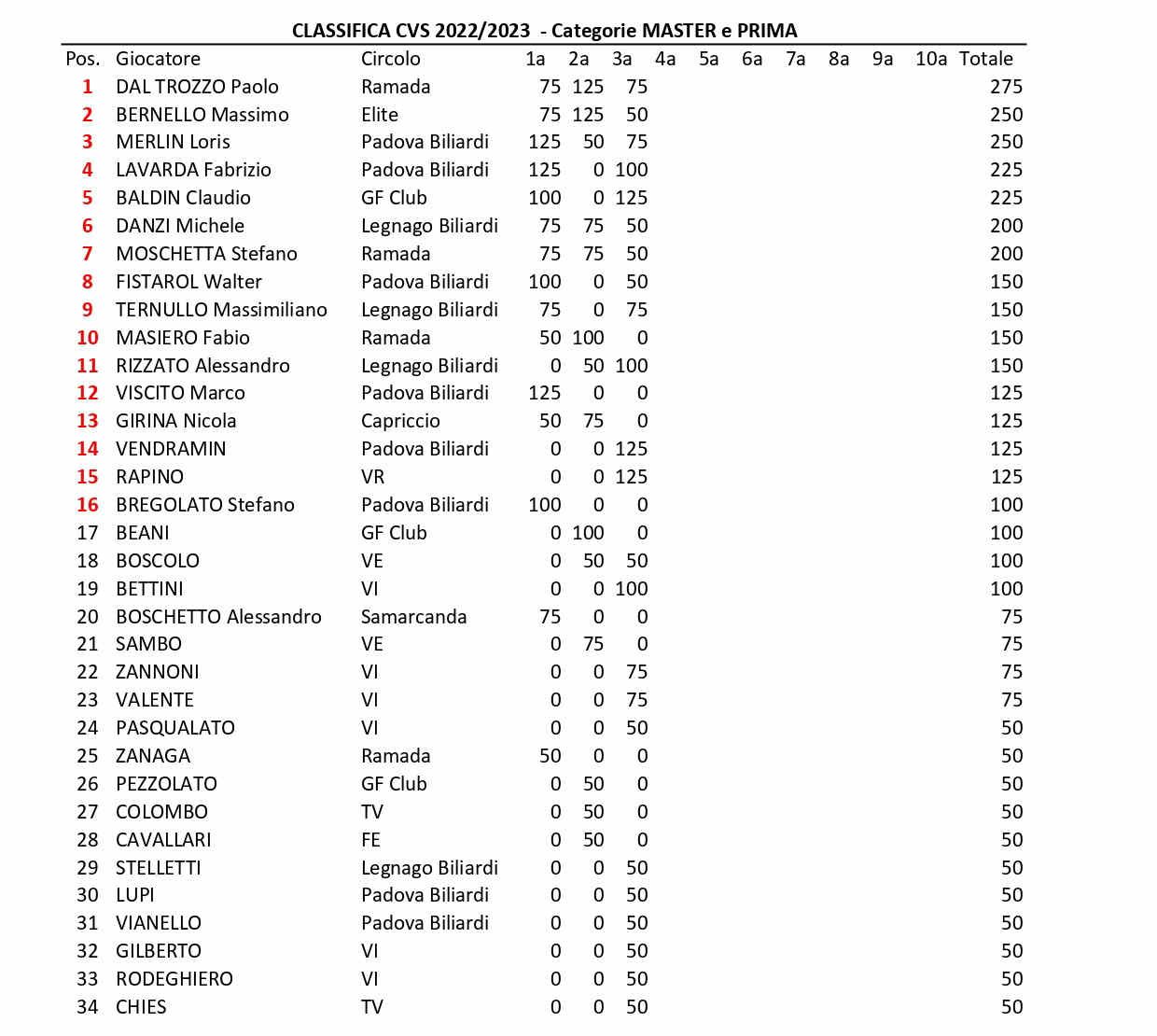 Nella Categoria Master e Prima si distinguono al primo posto DAL TROZZO Paolo del Circolo Ramada con 275 punti seguono a pari merito BERNELLO Massimo Circolo Elite e MERLIN Loris Circolo Padova Biliardi entrambi con 250 punti.