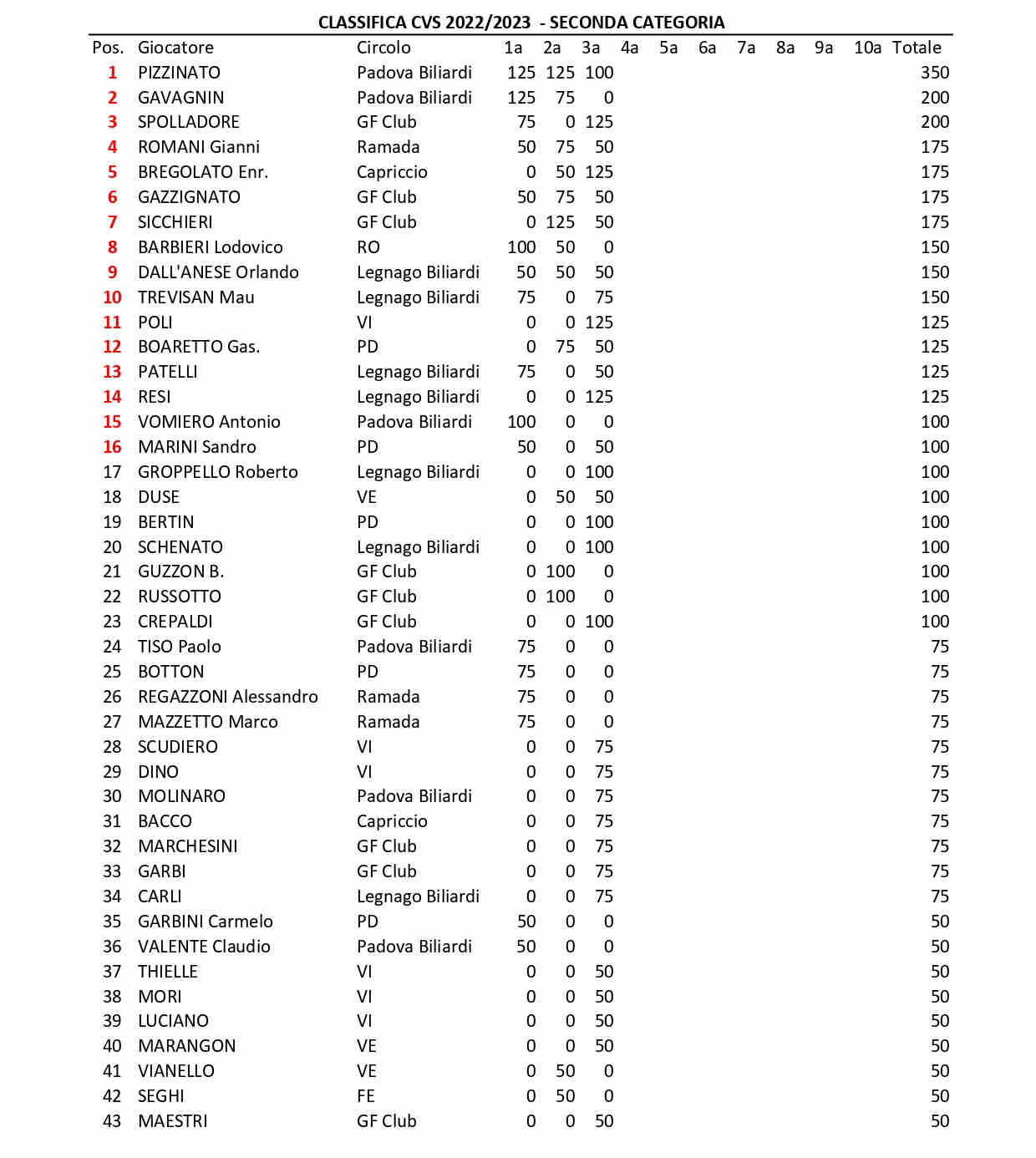 In Seconda Categoria si distinguono al primo posto PIZZINATO del Circolo Padova Biliardi con 350 punti seguono a pari merito GAVAGNIN del Circolo Padova Biliardi e SPOLLADORE del Circolo GF Club entrambi con 200 punti.