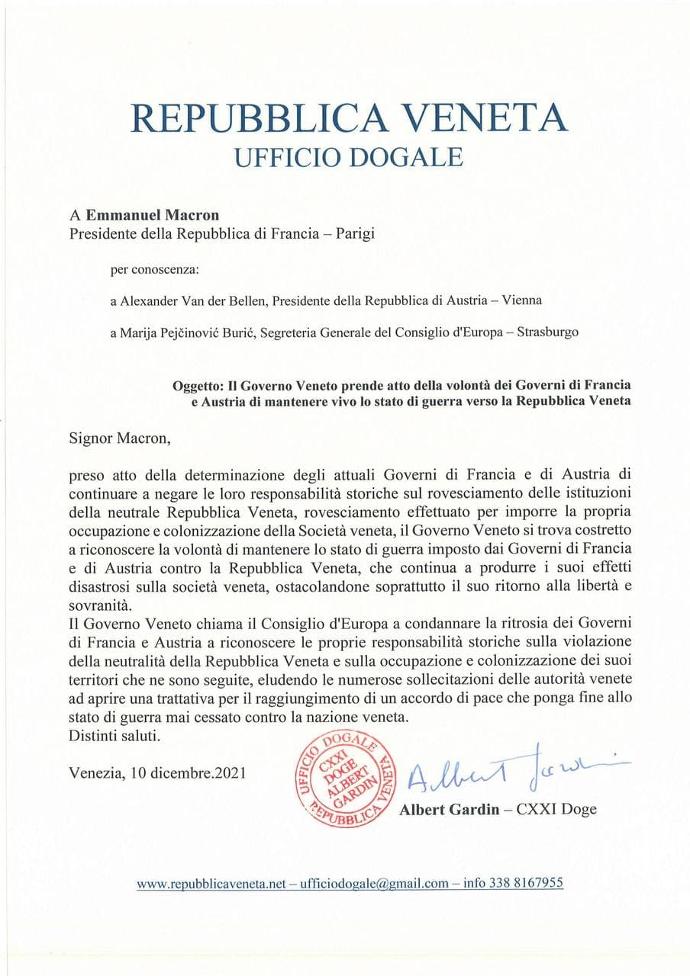 Il Governo Veneto prende atto della volonta' dei Governi di Francia e Austria di mantenere vivo lo stato di guerra verso la Repubblica Veneta