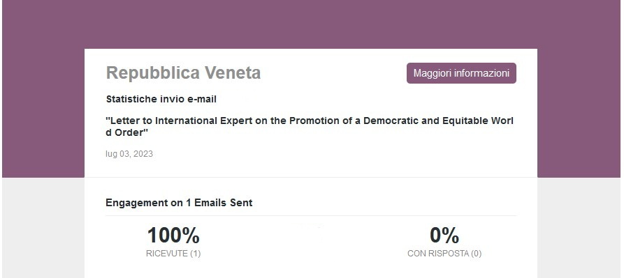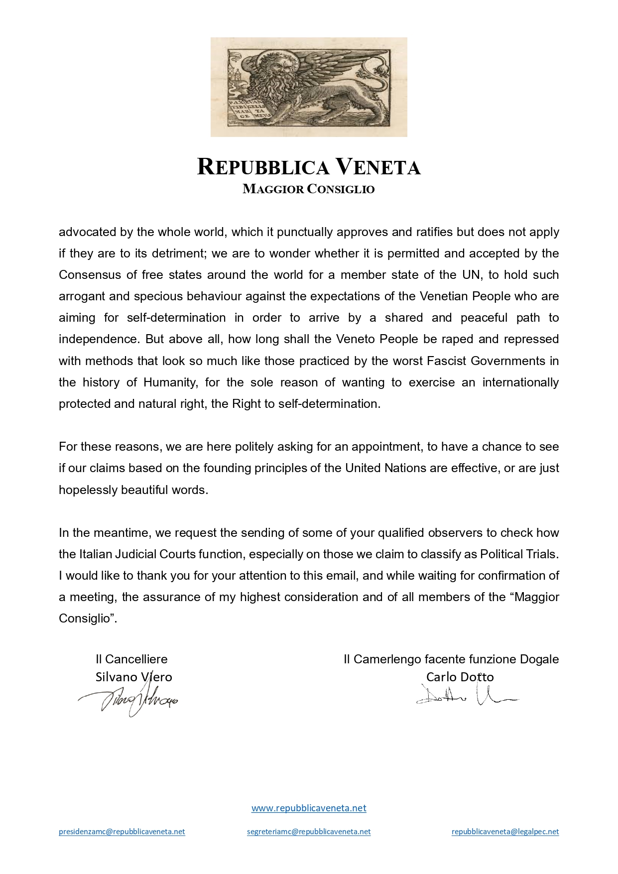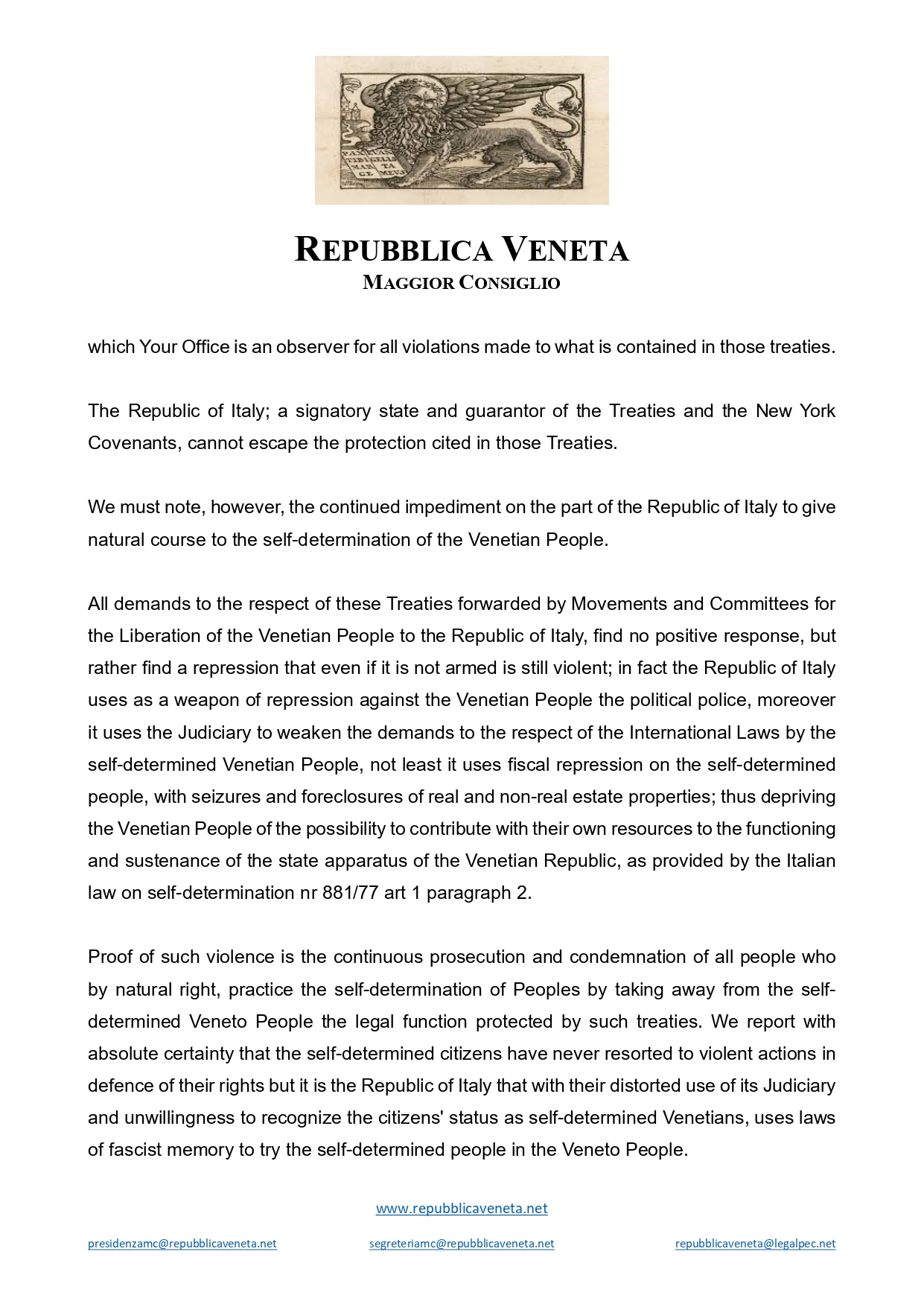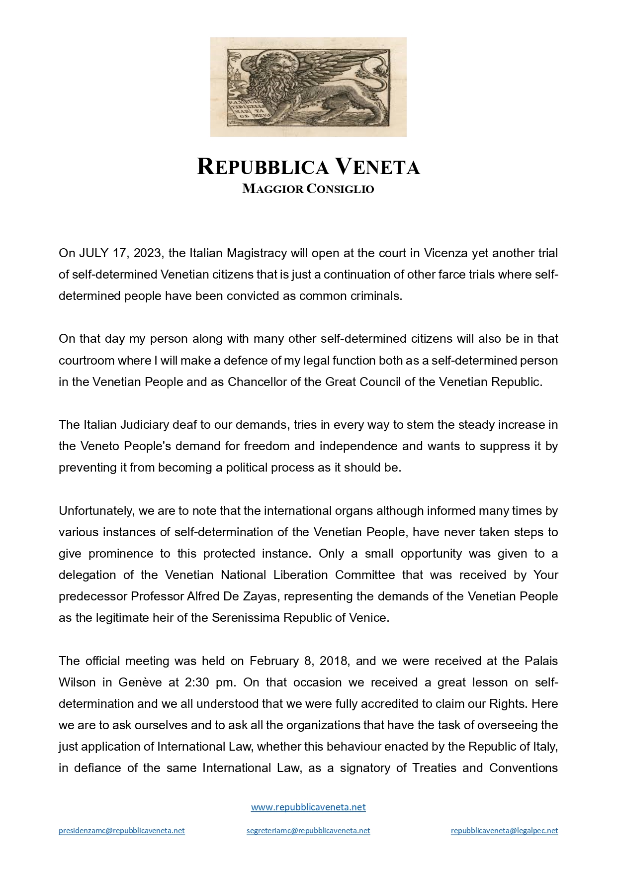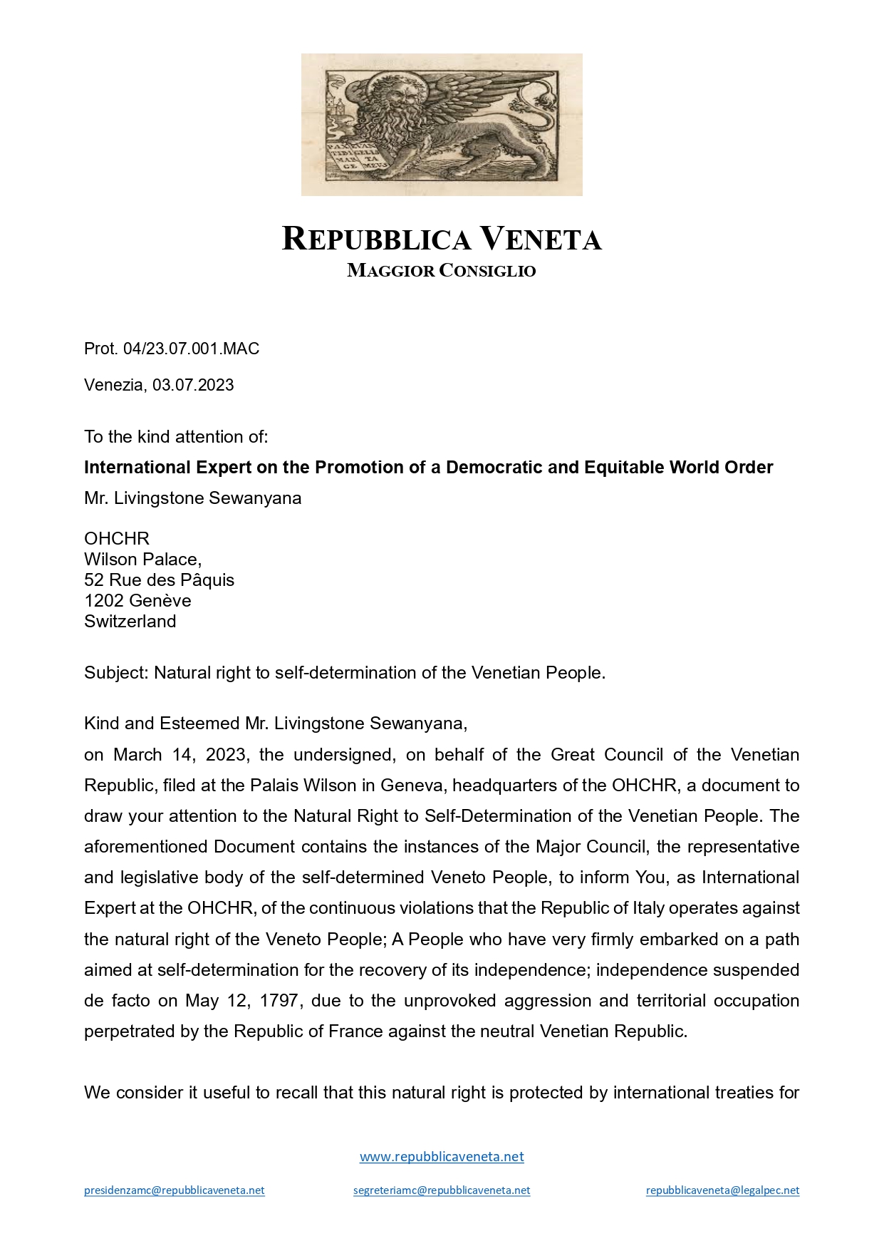 in data 14 marzo 2023, lo scrivente, per conto del Maggior Consiglio della Repubblica Veneta, ha depositato presso il Palais Wilson in Ginevra, sede dell’OHCHR, un documento per richiamare la Vostra attenzione sul Diritto naturale all’autodeterminazione del Popolo Veneto. Il Documento succitato contiene le istanze del Maggior Consiglio, organo rappresentativo e legislativo del Popolo Veneto autodeterminato, per informarLa, in qualità di Esperto internazionale presso l’OHCHR, delle continue violazioni che la Repubblica d’Italia opera nei confronti del diritto naturale del Popolo Veneto; Popolo che ha intrapreso con grande fermezza un percorso teso all’autodeterminazione per il recupero della propria indipendenza; indipendenza sospesa di fatto il 12 maggio 1797, a causa dell’aggressione immotivata e dell’occupazione territoriale perpetrata dalla Repubblica di Francia contro la neutrale Repubblica Veneta.