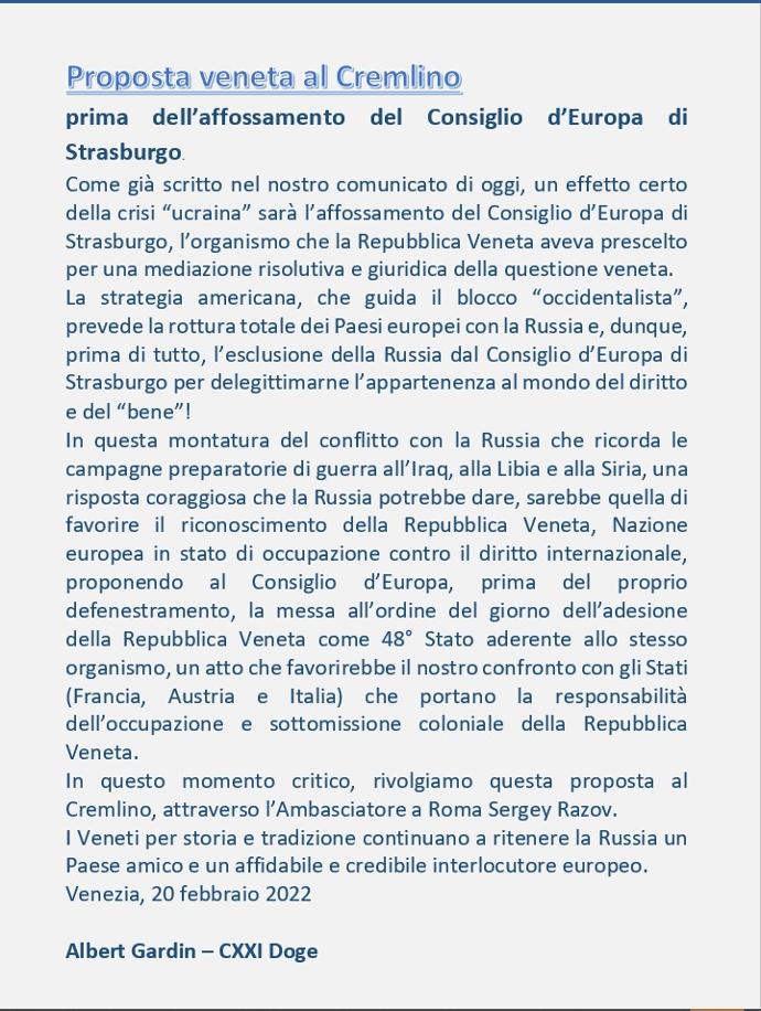 In questa montatura del conflitto con la Russia che ricorda le campagne preparatorie di guerra all’Iraq, alla Libia e alla Siria, una risposta coraggiosa che la Russia potrebbe dare, sarebbe quella di favorire il riconoscimento della Repubblica Veneta, Nazione europea in stato di occupazione contro il diritto internazionale, proponendo al Consiglio d’Europa, prima del proprio defenestramento, la messa all’ordine del giorno dell’adesione della Repubblica Veneta come 48° Stato aderente allo stesso organismo, un atto che favorirebbe il nostro confronto con gli Stati (Francia, Austria e Italia) che portano la responsabilità dell’occupazione e sottomissione coloniale della Repubblica Veneta.