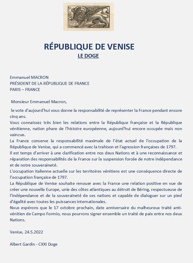 La Repubblica Veneta auspica di riprendere un rapporto positivo con la Francia nella prospettiva di realizzare una nuova Europa, unita dalle coste atlantiche allo Stretto di Bering, rispettosa delle indipendenze e sovranità delle sue nazioni e capace di dialogare alla pari con tutte le potenze internazionali.