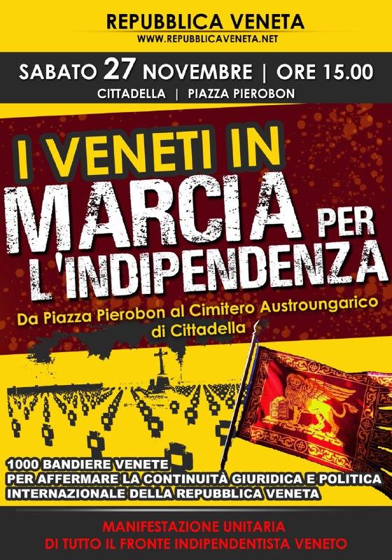 Il 27 novembre 2021 (ore 15.00), a Cittadella, i Veneti riprenderanno a marciare per dimostrare a se stessi e al mondo intero la loro determinazione a tornare liberi e indipendenti, e dunque a voltare pagina. Altre marce seguiranno mensilmente, fino a realizzare una grande manifestazione di massa che pesi sulle trattative internazionali in corso sul ritorno della Repubblica Veneta “dov’era e com’era” nel consesso internazionale. I Veneti hanno un bisogno vitale di tornare al proprio governo e alle proprie leggi per non continuare a subire politiche ingiuste, di rapina, coloniali e liberticide come quelle imposteci dallo Stato occupante e dalle sue congreghe internazionali! Dunque 1 – 10 – 100 – 1000 bandiere di San Marco a Cittadella, in uno spirito unitario e di ritrovata e forte fratellanza veneta.