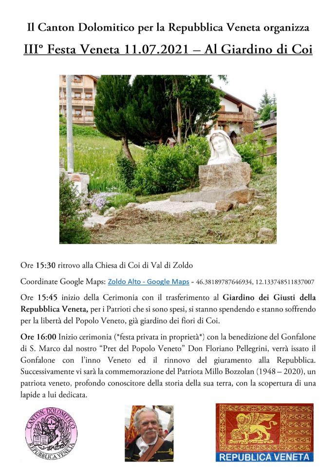 Ore 15:45 inizio della Cerimonia con il trasferimento al Giardino dei Giusti della Repubblica Veneta, per i Patrioti che si sono spesi, si stanno spendendo e stanno soffrendo per la libertà del Popolo Veneto, già giardino dei fiori di Coi.