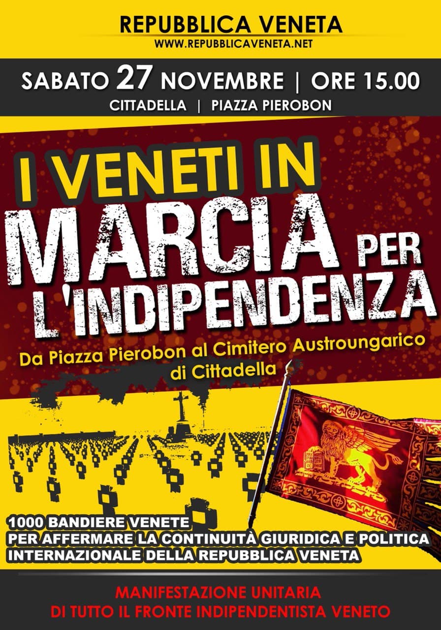Il 27 novembre 2021 (ore 15.00), a Cittadella, i Veneti riprenderanno a marciare per dimostrare a se stessi e al mondo intero la loro determinazione a tornare liberi e indipendenti, e dunque a voltare pagina.